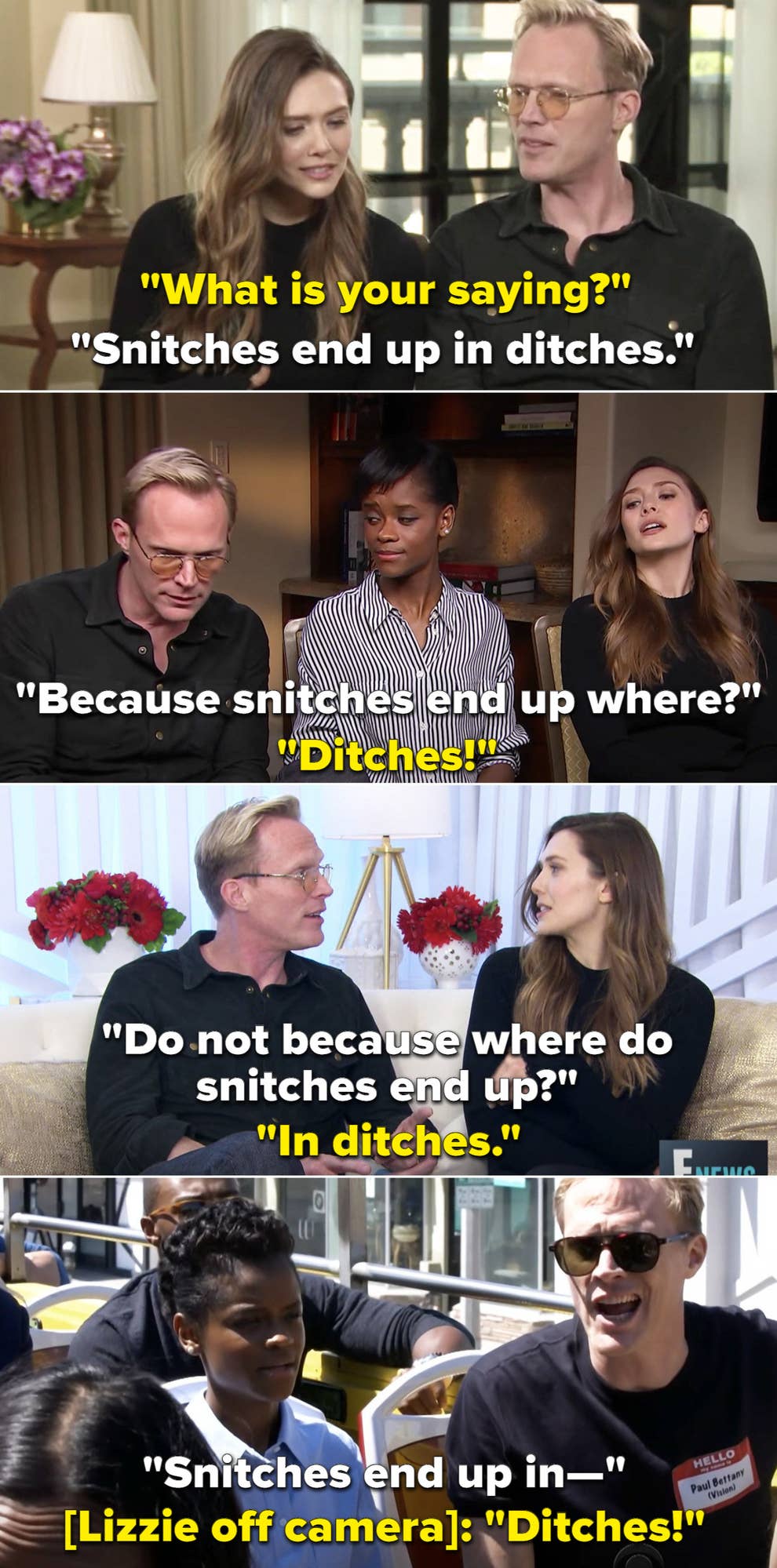 Snitches End Up in Ditches and Other Cautionary Tales. A compilation of paul bettany saying snitches end up in ditches. Find someone who loves you as much as paul bettany loves saying snitches end up in ditchessooooo this kinda blew up.